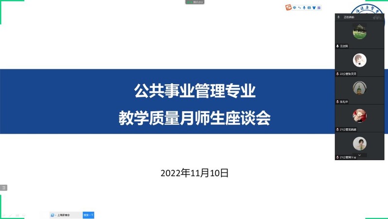 为进一步提升专业教学水平,深入了解近期教学工作,加强日常教学管理,规范教学运行,促进公司内涵式高质量发展。2022年11月10日19:30,william威廉英国官网公共事业管理教研室以线上方式召开期中教学质量师生座谈会,公共事业管理教研室全体教师及员工代表参加。