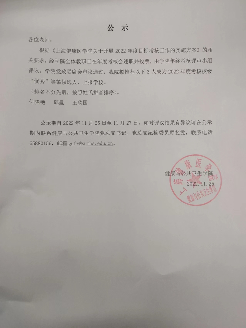 拟推荐2022年度考核校级优秀教职工候选人公示