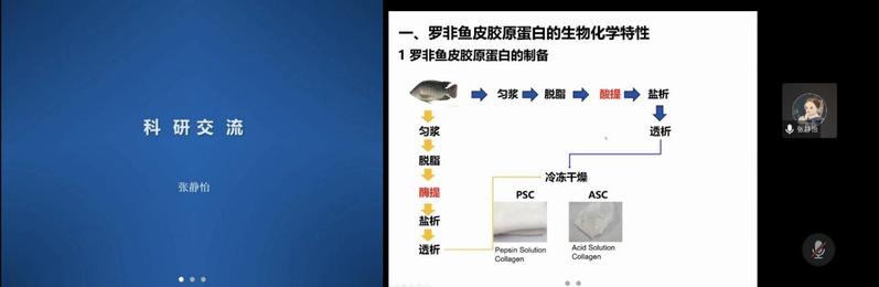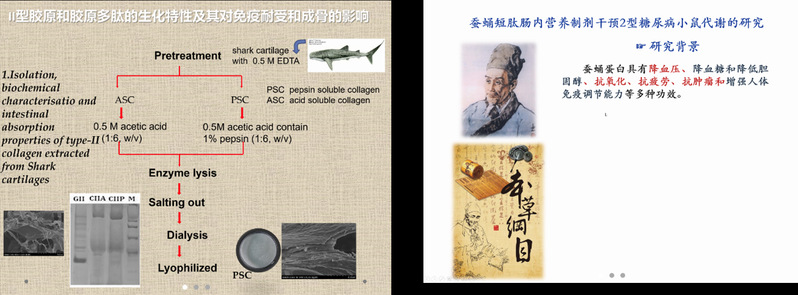 会上,张老师分享了她研究生期间所做的一些课题,她指出,将来源于海洋的罗非鱼鱼皮中的胶原蛋白提取出制作成生物材料,探讨提取出的胶原蛋白的生物化学特性,研究其生物学功能和生物组织作用,进一步探讨其在治疗烧伤等疾病中的作用。她重点介绍了探究胶原蛋白的生物组织相容性、免疫特性和抗菌性的实验方法。同时,张老师还分享了从鲨鱼软骨中提取得到的2型胶原和胶原多肽的生化特性、免疫耐受性及其对成骨和肠道循环的影响。