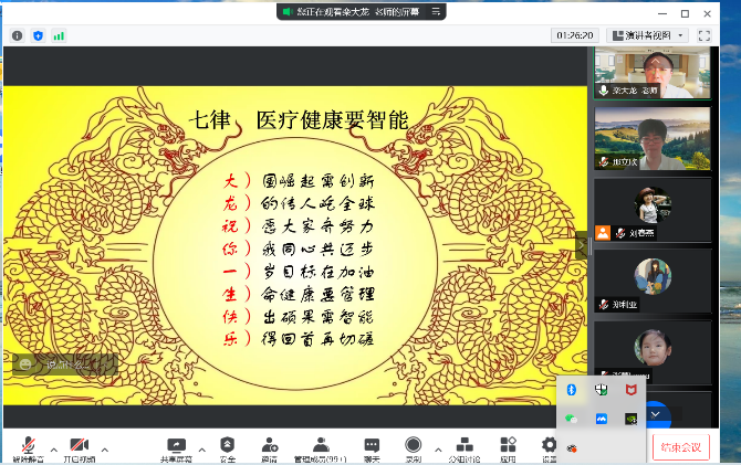 栾教授表示,智能医疗健康发展应聚焦于“用”,以面向人民生命健康为内核,以推动智能医疗健康基础层和技术层协调发展为手段,形成维护全民健康创新发展的开放系统。“智促医健”是新时代医疗服务的重大战略目标,已纳入国家医疗健康的顶层战略设计中,人工智能将将给未来医疗技术带来深刻的变化,是未来医学创新和改革的强大动力。栾教授以一首藏头诗结束了本次讲座,表达了对公共卫生公司美好的勉励与祝福。