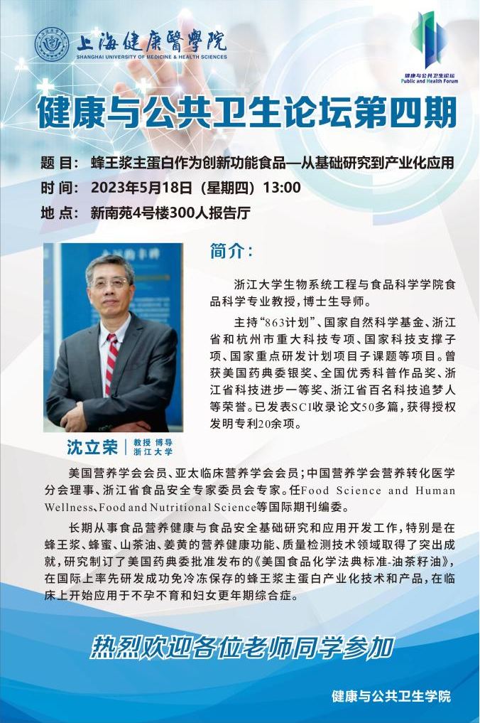 健康与公共卫生论坛第四期开讲,本次邀请到浙江老员工物系统工程与食品科学公司食品科学专业沈立荣教授做题为“蜂王浆主蛋白作为创新功能食品—从基础研究到产业化应用”的讲座。
