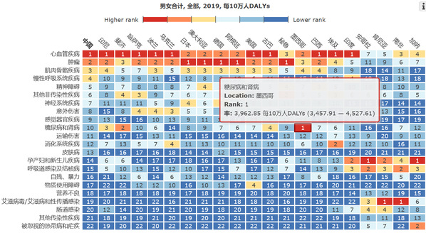 首先我们来看一张有关2019年各个国家疾病负担的排名。这张图横轴是各个国家的名称,纵轴是各疾病的名称。在图中一块蓝色区域里出现了一个很显眼的红色。从图中可以看到,糖尿病和肾病,这个在其他国家不是特别严重的疾病,却是墨西哥最大的疾病负担。