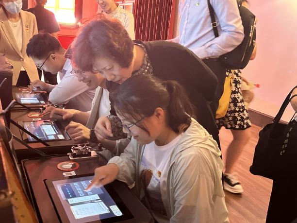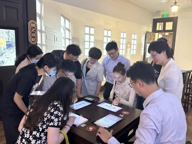 “复兴·颂”作为全国首个以数字互动体验为特色的复合式红色文化体验空间,运用“科技+游戏+互联网”的创新宣传展示方法,选取在中国共产党创建、大革命、土地革命战争、全民抗战、解放战争五个历史时期发生在黄浦的红色故事,打造“希望之门”“真理之路”“革命洪流”“利剑出鞘”“国之当歌”“迎接胜利”等主题,在讲解员的带领下,师生们沉浸式体验了VR实景互动、唱国歌、发电报等板块,通过先进的数字科技、有趣的互动体验,以年轻人喜闻乐见的方式讲述党史,这种强烈的代入感让师生们更进一步了解红色文化、体验红色文化。