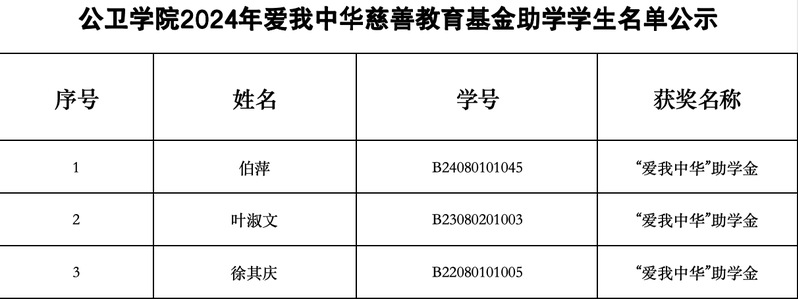 经员工自愿申报、辅导员初步审核、公司评审小组审核讨论,决定以下同学荣获2024年“爱我中华”慈善教育基金助学金,现进行院内公示,名单如下: