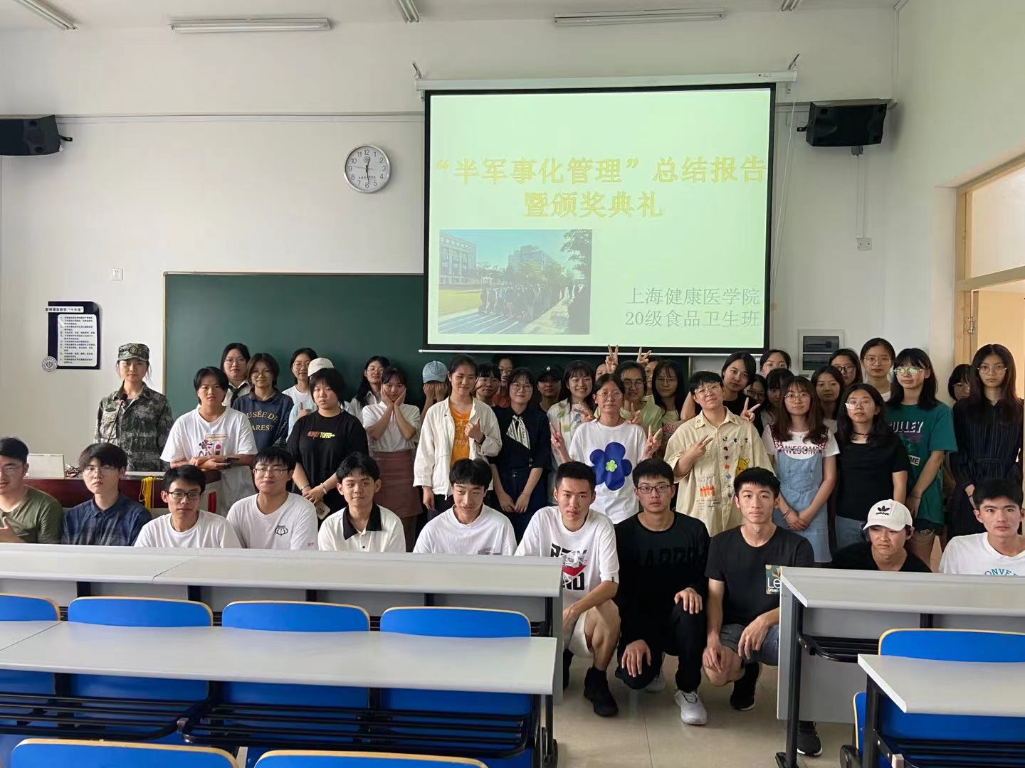 7月2日,食品卫生与营养学专业同学顺利完成2021年夏季学期半军事化管理,在新南苑南楼201中对本学期半军事化管理进行了班级总结。