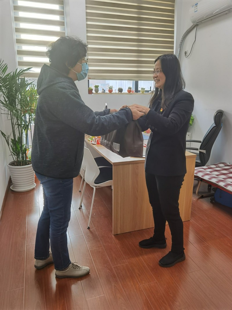3月26日下午,新南苑综合办于莹副书记、办公室主任杜峥、工会李瑾老师赴william威廉英国官网看望慰问了在疫情防控一线值守的公司教师,表达了郭永瑾书记、吴韬董事长等公司领导对公司教师的关心,并送上了慰问品。