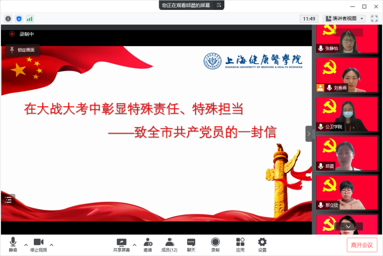 邱晨同志领学了中共上海市委组织部致全市共产党员的一封信,信中向奋战在全市抗疫一线的广大党员致以崇高敬意和亲切慰问!并倡议共产党员要带头担起政治责任,把防疫工作作为当前头等大事切实把思想和行动统一到习近平总书记重要讲话精神上来,统一到市委各项决策部署上;要带头发挥党员作用,坚守岗位履职尽责,积极投身防疫一线;要带头联系服务群众,倾听群众心声、传递群众诉求,积极组织群众、广泛发动群众;要带头做好宣传引导,要争当防疫政策的宣传员,争当弘扬正能量的示范员。我们坚信,有市委的坚强领导、有全市党员的担当作为,一定能打赢这场疫情防控阻击战,迎来阳光灿烂、春暖花开。