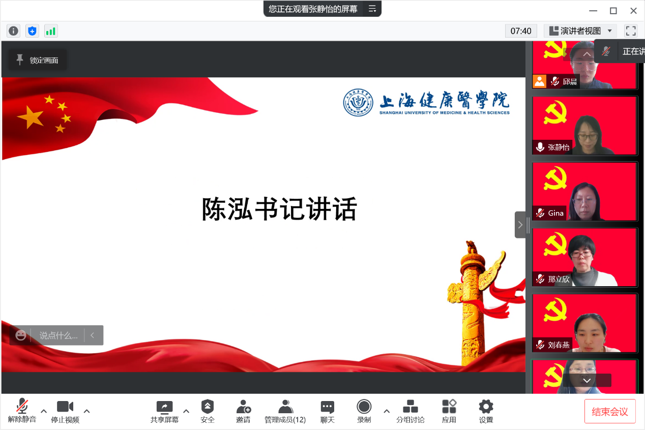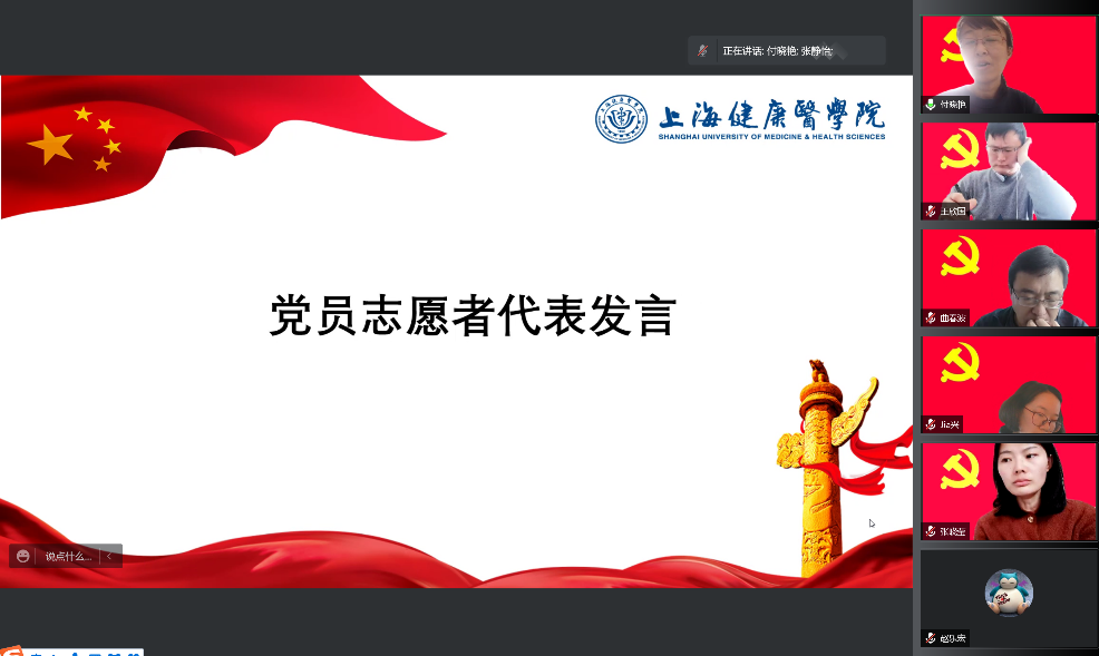 陈泓书记进一步向所有人介绍校内师生、浦东疾控的师生情况,对全体党员提出必须挺身而出,勇于担当,防控疫情是头等大事,密切关注权威渠道,不信谣不传谣,做好防疫工作的宣传员,同时关心员工的身心健康,多沟通多交流。 随后由三位党员志愿者代表邱晨、刘春燕和付晓艳进行发言。