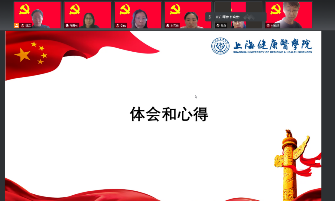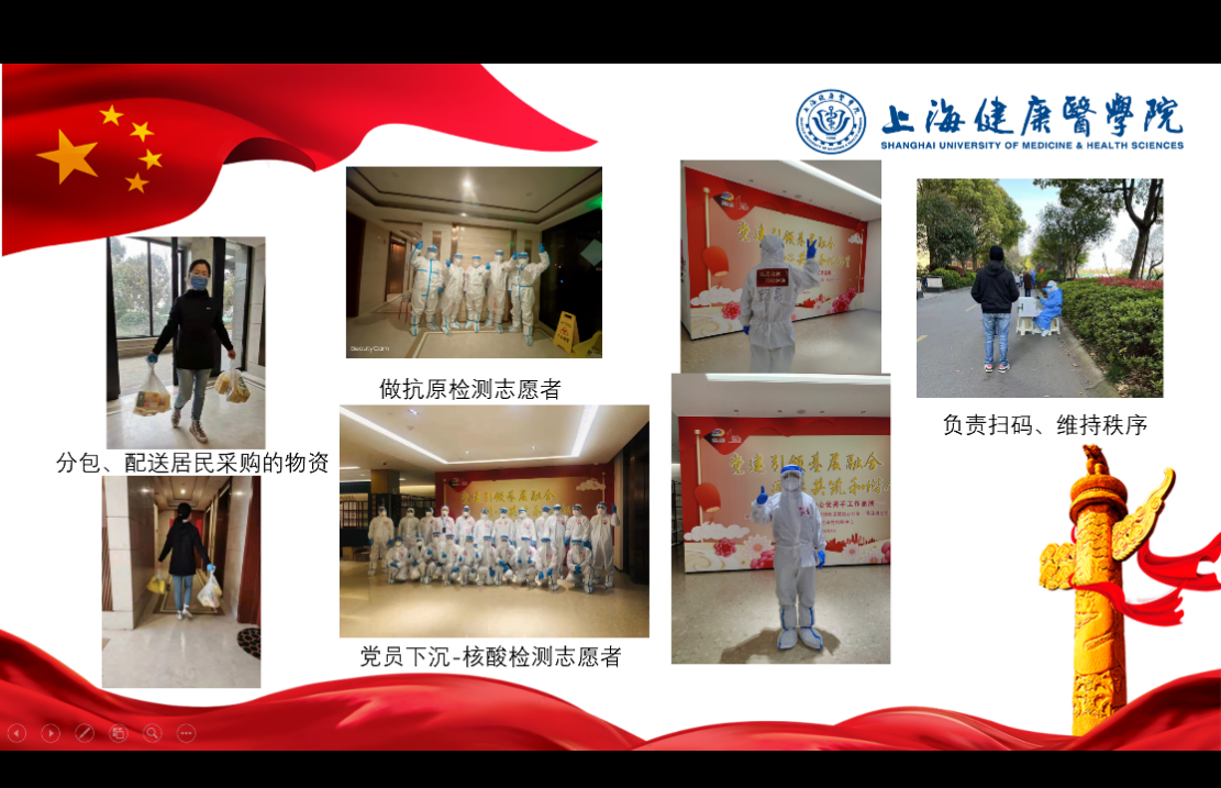 其他党员纷纷发表体会和心得。张晓莹老师在疫情期间不忘贡献出自己的力量,她积极报名给医务人员子女做晚托辅导的活动,已经设计了课程准备录制。王欣国老师在家里除了完成在线教学外,潜心研究公共事业管理专业建设,他表示虽然疫情隔离在家但是所有的工作都不能停,对上海动态清零的决心与信心绝不动摇。张蕊老师的爱人站在抗疫的第一线,张老师一个人既要照顾小家,还要完成日常工作,同时为公司抗疫志愿者做工作指导。李家兴老师亲身经历过武汉的疫情,在线上给予大家支持、鼓励与防疫妙招。张静怡老师这段时间与教研室的教师们每周四晚给员工进行辅导,督促在疾控中心做志愿者的同学们认真完成学习,对于本科评估的内容也是不断完善。运用自己的专业所长,参与起草楼栋管理须知,为小区疫情防控贡献出自己的力量。赵乐宏老师已经在浦东疾控中心与志愿者员工一起工作一个多月,事事尽心尽力,同时时刻关注员工的心理与生活。这段时间那立欣经理在浦东疾控中心陪伴员工,更加让赵老师和同学们安心、放心。