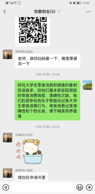 而刘春燕老师带队的是“食在健康”项目。由21级徐旻皓担任队长,本项目打破传统的按照食品原料及加工形式等进行分类的模式,根据特殊人群(婴幼儿、儿童青少年、成人、老人、孕妇)的生理需求特点、慢病人群等进行食品分类管理,赋予食品“精准”营养及“靶向干预”新理念。结合网络平台,开发营养到家APP,建立集营养科普,营养健康产品设计、生产、销售及营养相关疾病管理为一体的综合服务平台,旨在推动营养健康科普宣教常态化开展,普及合理膳食等健康生活方式,完善食品安全基础上的精准营养,加强对营养健康产品和服务供给的引导,提供高标准、高精度、高效率的全生命周期的营养健康服务,使其真正契合不断发展变化的我国居民营养健康需求,切实推动合理膳食行动落地见效。