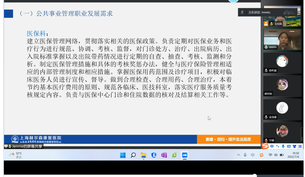 郑佩文老师从医院的组织架构,党政办规章制度和岗位职责,职业发展需求前景这三个部分展开讲座,结合赫尔森康复医院的实际情况,与在线的同学们进行分享交流。